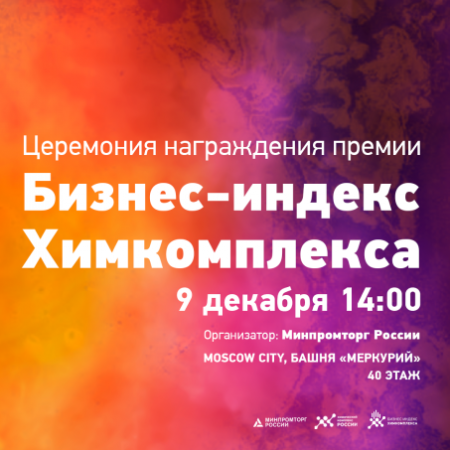 Премия «Бизнес-индекс Химкомплекса» учреждена Минпромторгом России и вручается в 7 номинациях за наиболее успешную реализацию лучших проектов в сфере развития химического комплекса России.